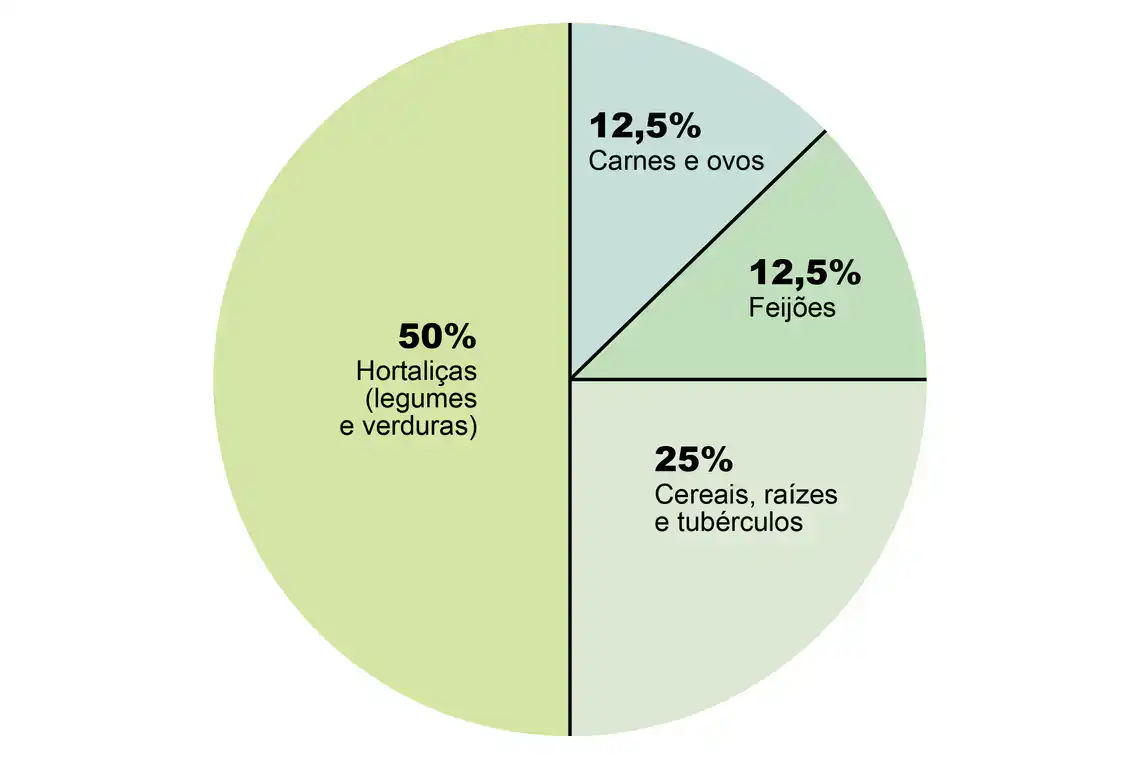 É importante que metade do seu prato tenha hortaliças, ou seja, tudo o que vem da horta! Um quarto deve ser ocupado por cereais, raízes e tubérculos, e o outro quarto se divide entre leguminosas e carnes e ovos.